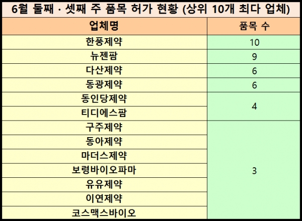 업체별로는 ▶ 한풍제약 (10품목) ▶ 뉴젠팜 (9품목) ▶ 다산제약·동광제약 (6품목) ▶ 동인당제약·티디에스팜 (4품목) ▶ 구주제약·동아제약·레고켐제약·마더스제약·보령바이오파마·아리제약·유유제약·이연제약·코스맥스바이오 (3품목) 순으로 신규 허가품목 수가 많았다.