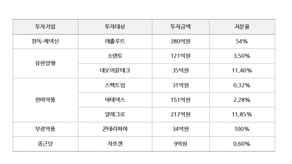 ▶국내외 바이오벤처 투자=국내 제약사는 국내외 바이오벤처 투자를 활발하게 하고 있다. 해외 바이오벤처부터 살펴보면, 한독과 제넥신은 레졸루트에 약 280억원 규모를 투자해 54%의 지분을 갖고 있다. 유한양행은 소렌토와 네오이뮨테크에 각각 121억원, 35억원을 투자해 3.5%, 11.4%의 지분율을 갖고 있다. 또 한미약품은 스펙트럼, 아테넥스, 알레그로에 각각 31억원, 151억원, 217억원을 투자해 0.32%, 2.28%, 11.85%의 지분을 갖고 있다.