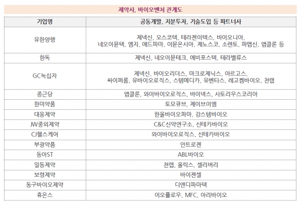 또 국내 제약사는 국내 바이오벤처와도 공동개발, 지분투자, 기술도입 등을 통해 파트너 관계를 맺고 있다. 구체적으로 살펴보면 유한양행은 제넥신, 오스코텍, 테라젠이텍스, 바이오니아, 파맵신 등과 파트너 관계를 맺어 국내 제약사 중 가장 많은 바이오벤처와 오프이노베이션 전략을 취하고 있다. GC녹십자는 제넥신, 바이오리더스, 마크로제닉스, 아르고스, 레코켐바이오 등과 관계를 맺고 있다.