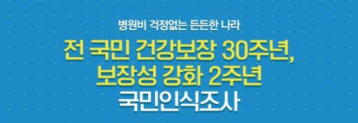 국민건강보험공단(이사장 김용익)은 전 국민 건강보장 30주년과 보장성 강화 2주년을 맞아 여론조사 전문기관인 한국리서치에 의뢰해 실시한 대국민 여론조사를 19일 발표했다. 이번 조사는 6월 4~10일(주말?공휴일 제외) 총 4일간 전국 만19세 이상 성인남녀 2,000명을 대상으로 전화면접조사로 실시됐다. 95% 신뢰수준에 표집오차는 ±2.2%p이다.