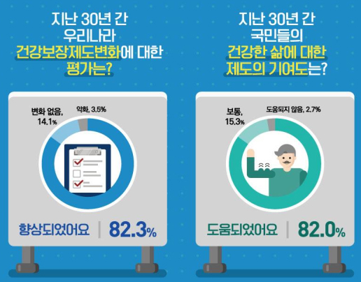 여론조사 결과, 지난 30년간 우리나라 건강보험제도가 ‘향상됐다’(매우 향상 26.9%, 대체로 향상55.5%)는 긍정평가가 국민 10명 중 8명 이상인 82.3%로 나타났다.