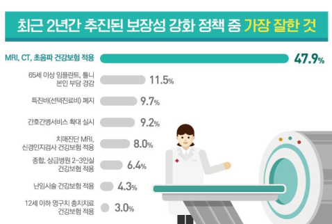 보장성 강화 정책 사업 중 가장 잘한 것이 무엇인지에 대해서는 47.9%가 ‘MRI, CT, 초음파 건강보험 적용’을 1위로 꼽았다. 다음은 ‘65세 이상 임플란트, 틀니 본인부담 경감’ 11.5%, ‘특진비(선택 진료비) 폐지’와 ‘간호간병서비스 확대 실시’ 각각 9.7%와 9.2% 순으로 나타났다.
