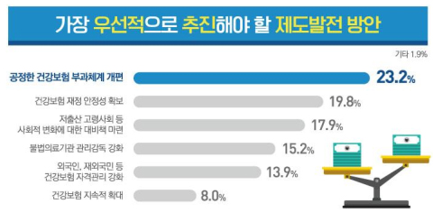 앞으로 제도발전을 위해 가장 우선적으로 추진해야 할 방안으로 국민들은 ‘공정한 부과체계개편’(23.2%)을 1순위로 꼽았다. 다음은 ‘건강보험 재정 안정성 확보’(19.8%)였다. 또 ‘저출산 고령사회 등 사회적 변화에 대한 대비책 마련’(17.9%)은 3위를 차지했다.