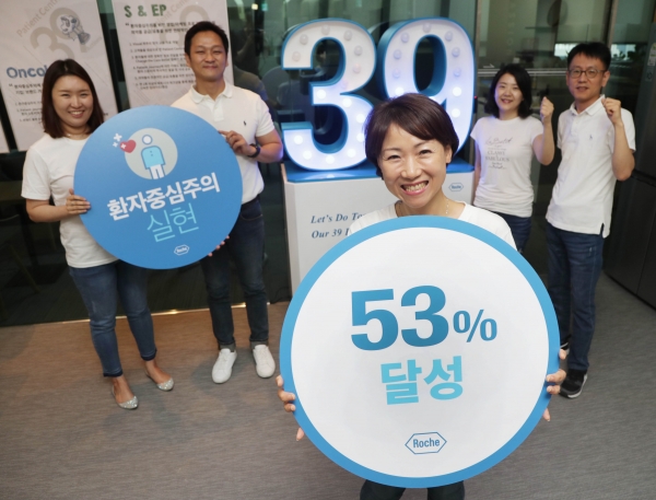 ㈜한국로슈(대표이사 매트 사우스)는 환자 가치를 최우선에 둔 사내 문화와 비즈니스 혁신을 목표로 제정한 ‘환자중심주의(Patient Centricity) 실현을 위한 39가지 액션 플랜’을 올해 말까지 100% 달성하는 것을 목표로 하고 있는 가운데, 6월 현재까지 총 21개를 달성하며 50% 이상의 달성률을 기록했다고 중간 점검 결과를 발표했다.
