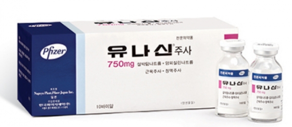 한국화이자제약의 항생제 주사제 '유나신주사 750mg' 10V 제형이 내년까지 공급이 중단된다.