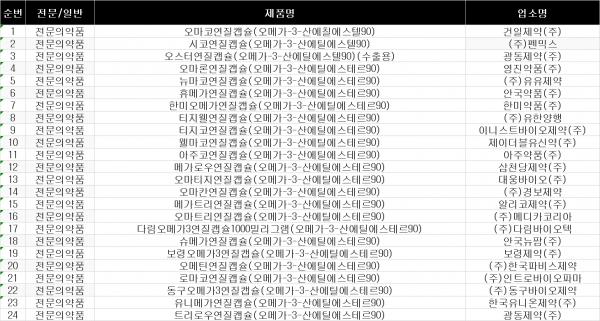 한편, 오메가-3 지방산 함유제제는 건일제약 오마코연질캡슐과 위임형 제네릭인 펜믹스 시코연질캡슐 등 24품목이 시판 중이다.