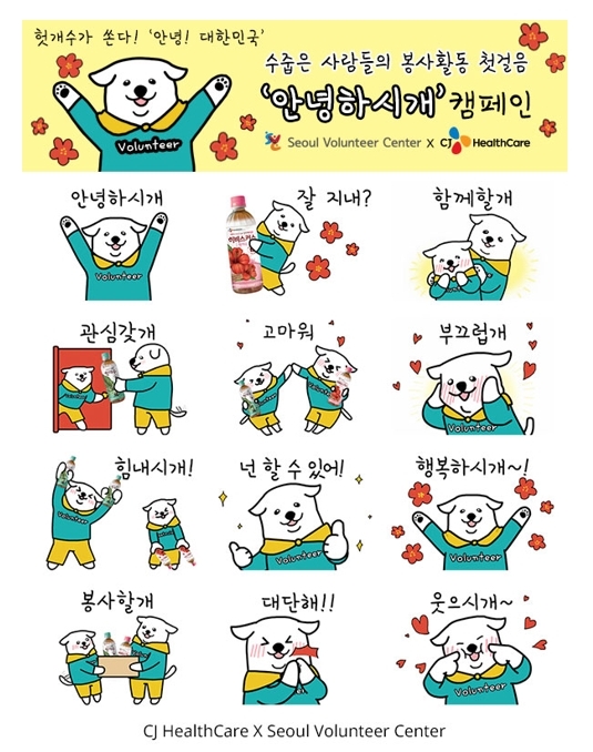 이번 캠페인에서 CJ헬스케어는 CJ헬스케어의 헛개수와 서울자원봉사센터의 캐릭터 ‘붐붐이’가 그려진 카카오톡용 이모티콘 제작을 지원했다. 강아지 캐릭터의 특징을 살려 헛개수와