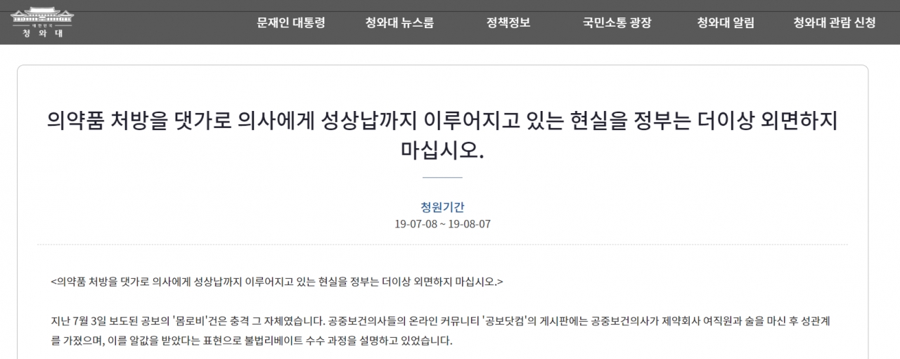 의약품 처방을 댓가로 의사에게 성상납 리베이트까지 했다는 '공보의 파동'이 청와대 국민청원까지 갔다. 약사단체 약준모는 8일 청와대 국민청원에 공중보건의사와 제약회사 여직원 간 불법리베이트 수수 과정 문제를 지적했다.