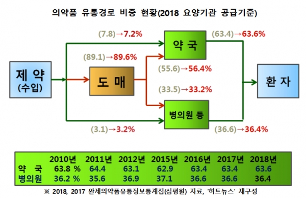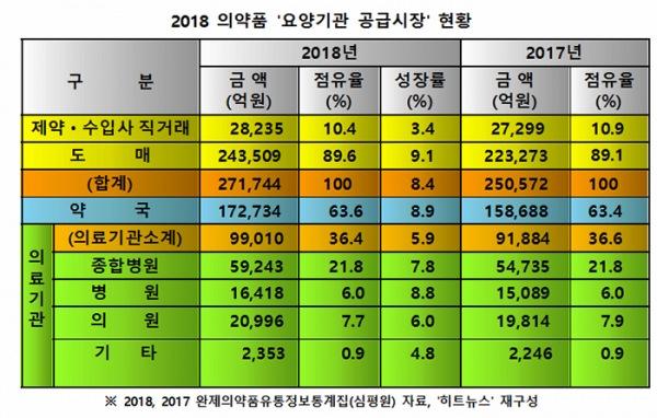 2018년, 도매유통사들(이하 '도매유통')은 요양기관(약국 및 의료기관)에 24조3509억 원의 의약품을 공급한 것으로 나타났다. 2017년 22조3273억 원보다 9.1%(2조236억 원) 증가됐다. 요양기관에 대한 의약품 전체 공급금액 27조1744억 원의 89.6%나 된다. 나머지, 10.4%인 2조8235억 원의 의약품은 제약사들과 수입사들에 의해 요양기관에 직접 공급됐다.
