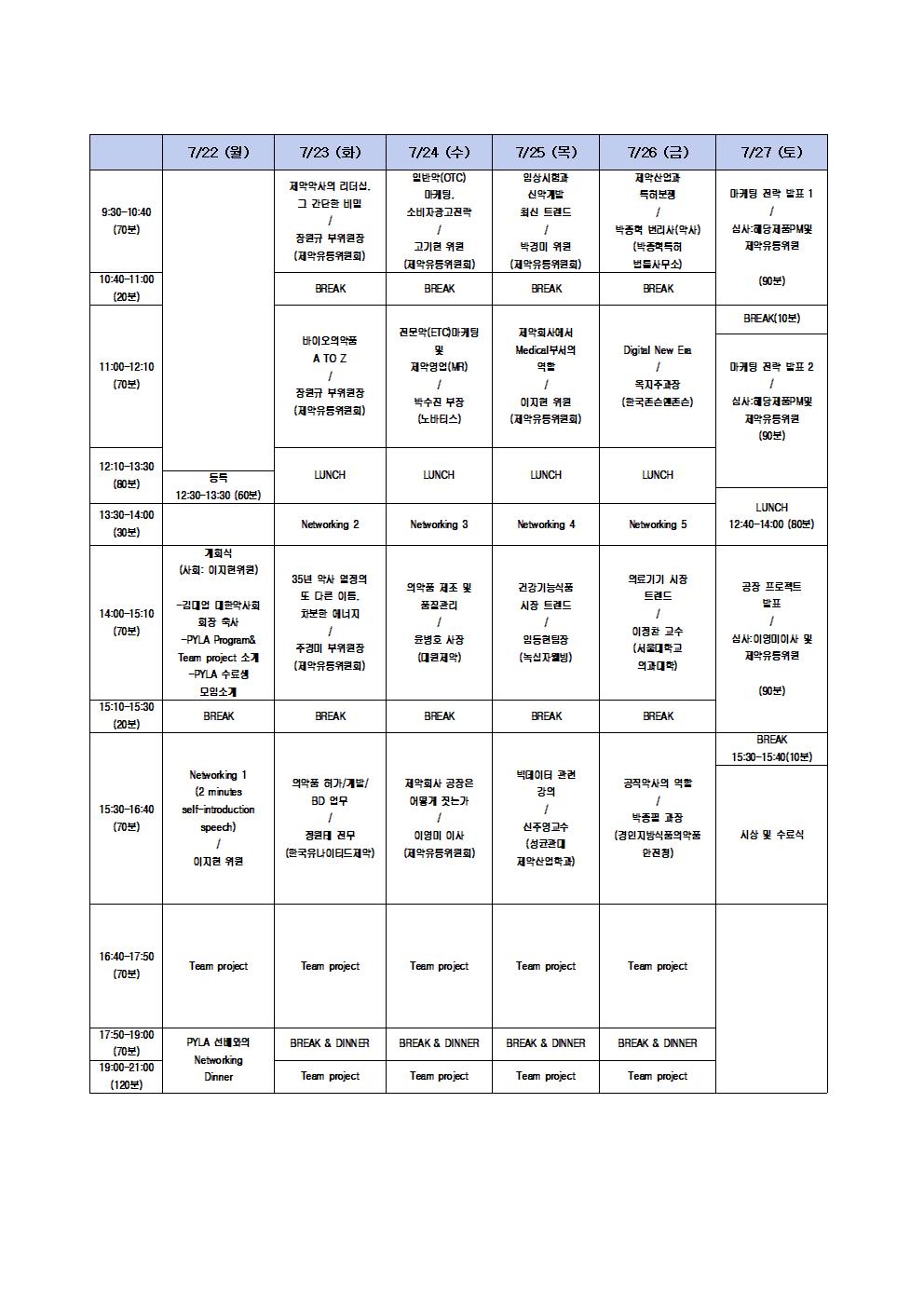 PYLA를 주관하는 이영미 제약유통위원장은 "R&D와 생산품질, 임상, 유통, 특허, 마케팅 등 평소 접하기 힘든 제약산업 핵심분야 강의를 개설했으며 학생들이 직접 참여하는 프로젝트 전략발표 경연대회도 열 예정"이라고 밝혔다.