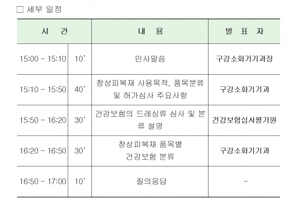 주요내용은 ▲창상피복재의 품목 분류 및 심사 내용(식약처) ▲드레싱류의 건강보험 심사 절차 및 분류(심평원) ▲창상피복재 품목별 건강보험 분류 흐름도 및 예시 등이다.